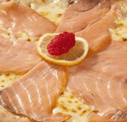 Crème fraîche, mozzarella, saumon fumé, citron, roquette, tomates cerises.